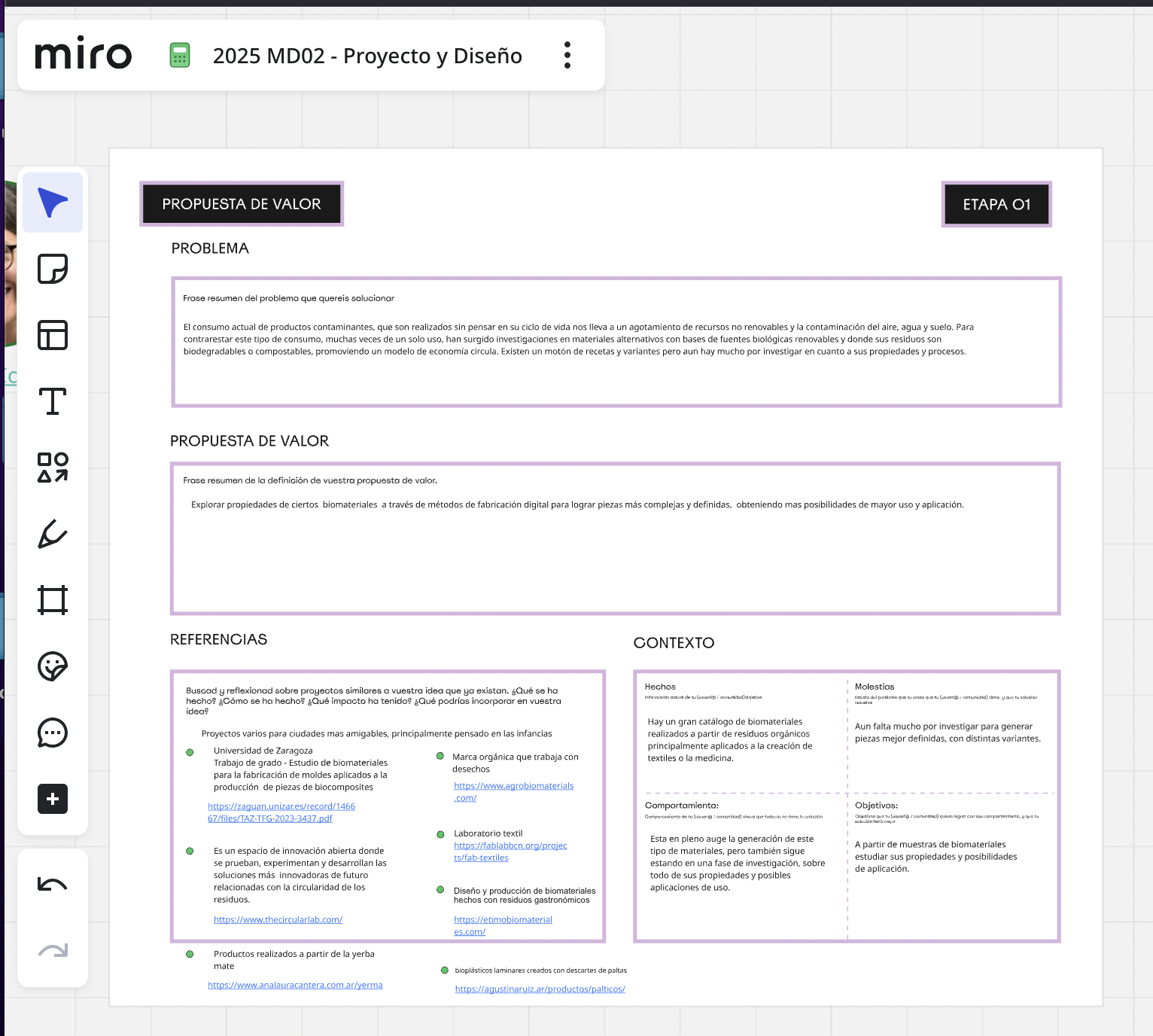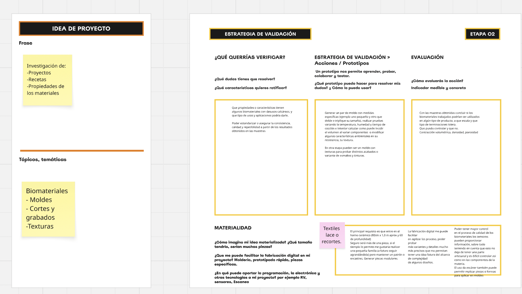 Refelexión A veces cuesta definir. Siempre tengo mucho temas que me interesan trabajar y que se pueden abordar desde el diseño. Desde que me anoté a la especialización, he intentado identificar mis intereses y fortalezas pensando en como acotar y centrarme en un tema. En el tema urbanismo me parece que hay mucho por hacer, que puede tener un impacto más inmediato con ciertas intervenciones y además, cuento con un entorno de profesionales que militan en el tema. Pero también lo veo más complejo porque depende de muchas políticas públicas, además del cambio de hábito de la gente, como en toda intervención de diseño. Por otro lado, me motiva mucho más investigar en biomateriales, combinar una parte de laboratorio casero y otra de fabricación digital. Si me sincero es un tema que lo tengo en la cabeza desde hace mucho tiempo, por eso decidí continuar con esta linea.