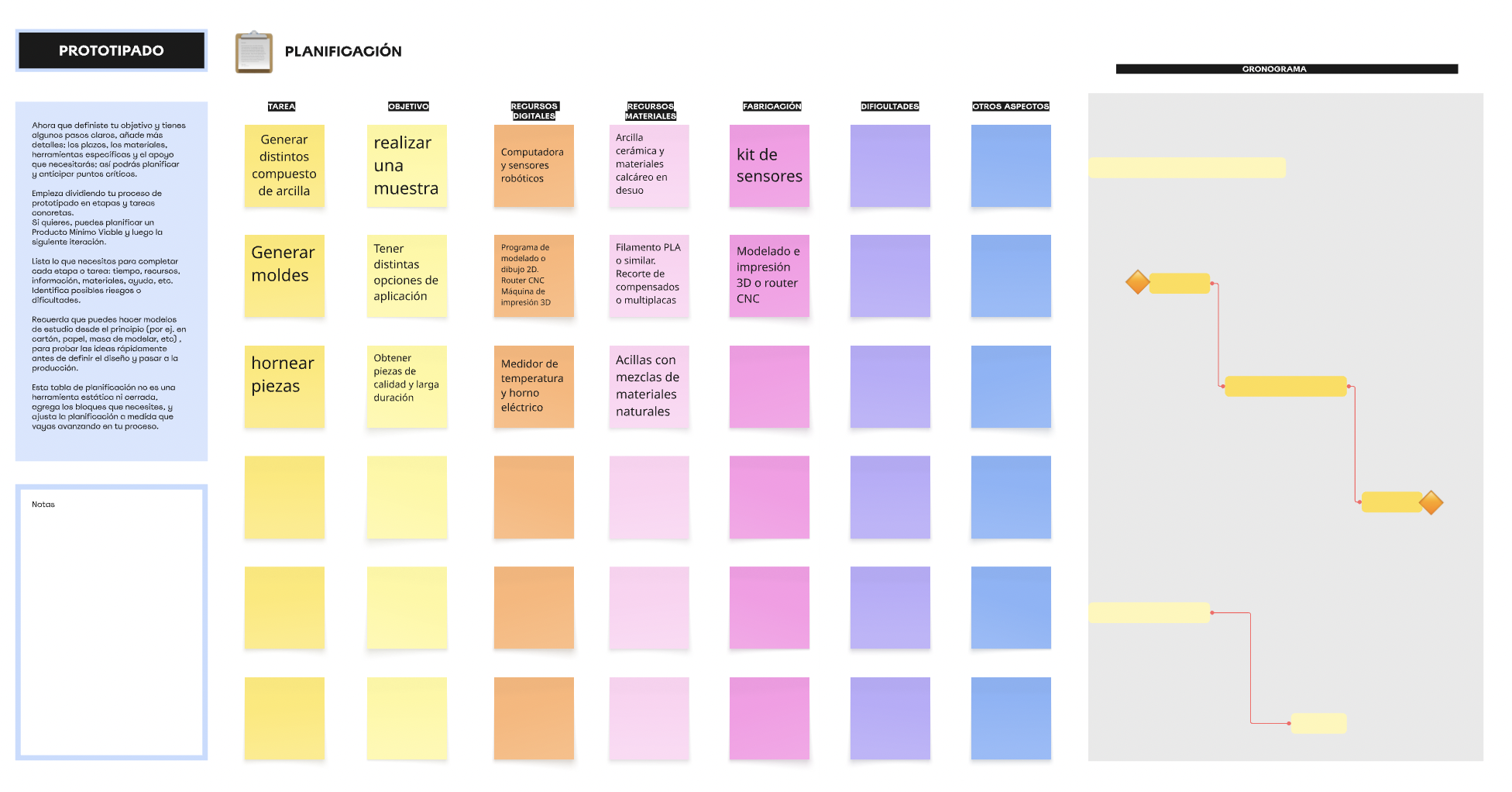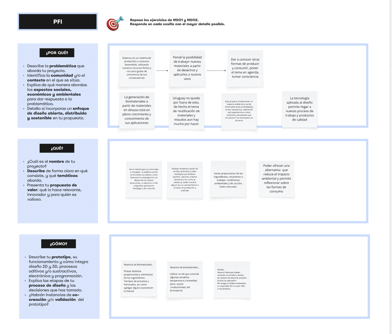En este módulo comencé repasando los módulos anteriores de diseño MD01/MD02. Completé un poco más el Miro, las fichas anteriores, ya que en la medida que avanzo voy aclarándome hacia atrás, del mismo modo en que voy definiendo por donde seguir. Partiendo desde el “qué” y “para quien” fui identificando y desarrollando mi idea de experimentar arcillas con otros materiales naturales en desuso.
