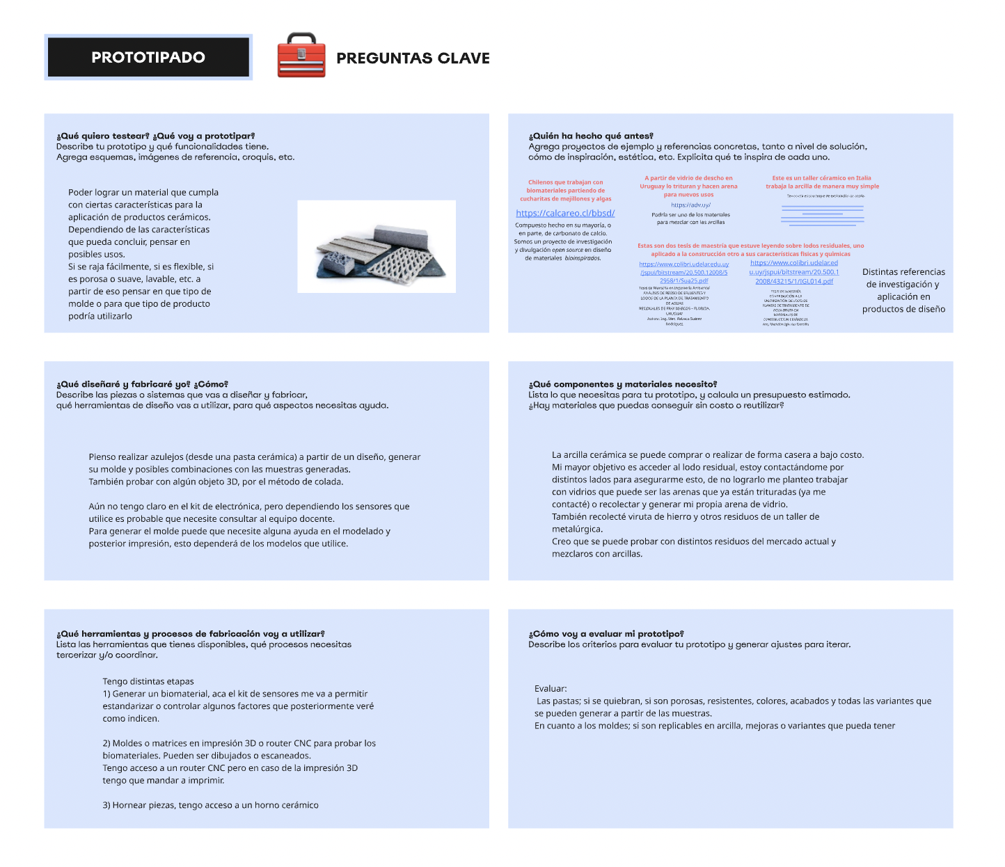 Prototipar moldes y generar una muestra de arcillas para concluir cuales podrían ser sus aplicaciones futuras, que problema podría solucionar o apaliar, y que impacto territorial pueda tener.