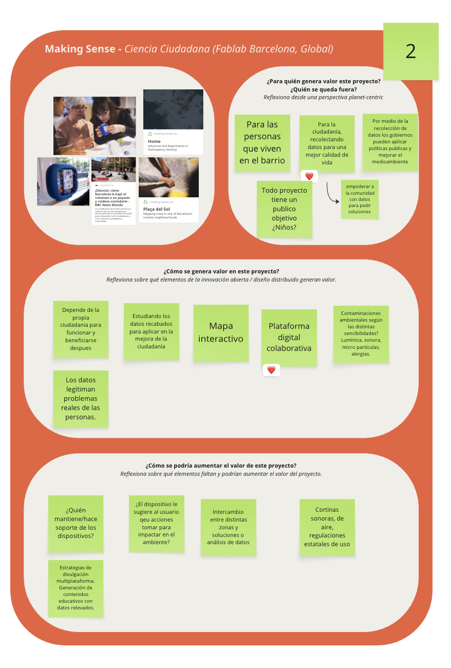 Con todo esto conversado, realizamos otro ejercicio. Esta vez, a partir de un ejemplo, explicar como se generó valor y para quien, y como se podría continuar con el proyecto de manera de aumentar su valor, pensando en que en el diseño colectivo siempre se puede seguir modificando y sumando cosas. En mi caso trabajé con Josefina y Lucho en el proyecto Ciencia Ciudadana (Fablab Barcelona, Global)