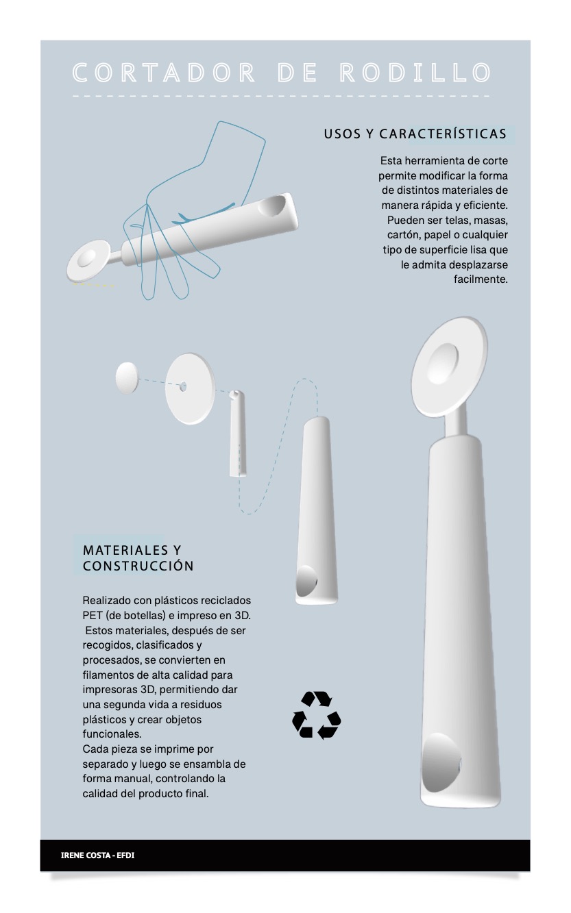 Una vez modelado el cortador, necesitaba distintas imágenes y un despiece para mostrar en la entrega final. El tema acá fue como exportar imágenes que pudiesen abrirse en Illustrator o Photoshop, ya que los archivos .stl no permite colocarlos. Para exportarlo como .jpg o.png debo ir al Espacio de trabajo del renderizado. Pero ahí me pasó que me mostraba los planos y no logré las imágenes que quería. Como en este caso la lámina es digital, las imágenes no tenían porque ser de muy buena calidad, ya que para pantalla puedo trabajar con imágenes de tamaño medio. Entonces, tomé los archivos .stl y les saqué foto de pantalla. Luego los abrí en Photoshop, le quité sus fondos y los pasé como .png. Ya con las imágenes de las distintas partes del objeto sin sus fondos, armé la lámina en Illustrator. En Freepik busqué una lámina vectorizada que me gustara y la edité. Tomé el fondo de color y el título y la diagramé con los requisitos de la premisa. Busqué una imagen cualquiera de una mano cortando algo. A partir de eso, dibujé una mano para dar situación de uso con el lazo. Luego busqué en google características de estos cortadores de rodillo y de la impresión 3D con material reciclable, de manera de generar los textos que acompañan las imágenes.
