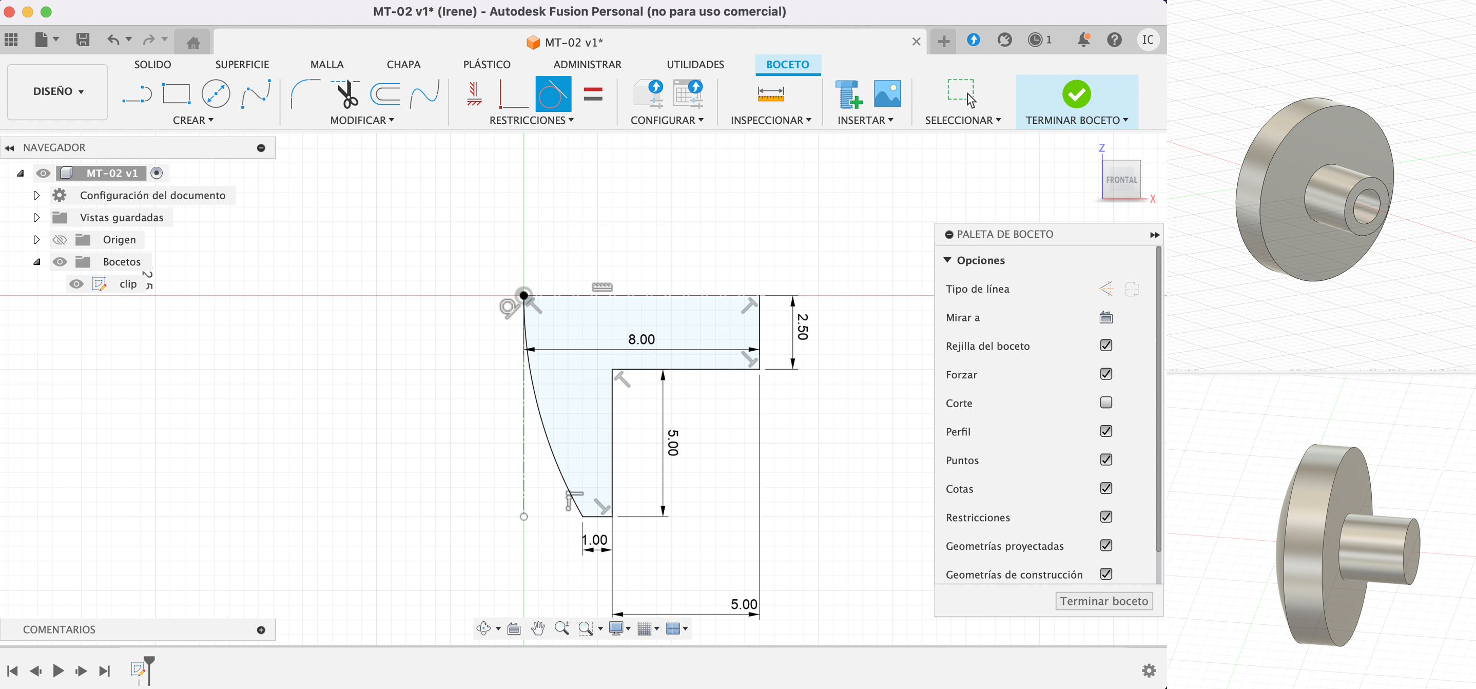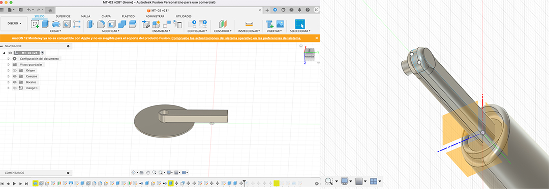 Agarre. Este fue el que me llevó mas tiempo desde la parte constructiva. Quería realizar una pieza pero ninguno de los ejemplos me gustaban, al dibujarlas me complicaban o me parecían desproporcionadas. Luego que logré bocetar en papel y definir como lo quería, fue muy simple. - Elegir el plano de sketch, dibujar la mitad para luego realizar una simetría. - Terminar sketch y extruir.
