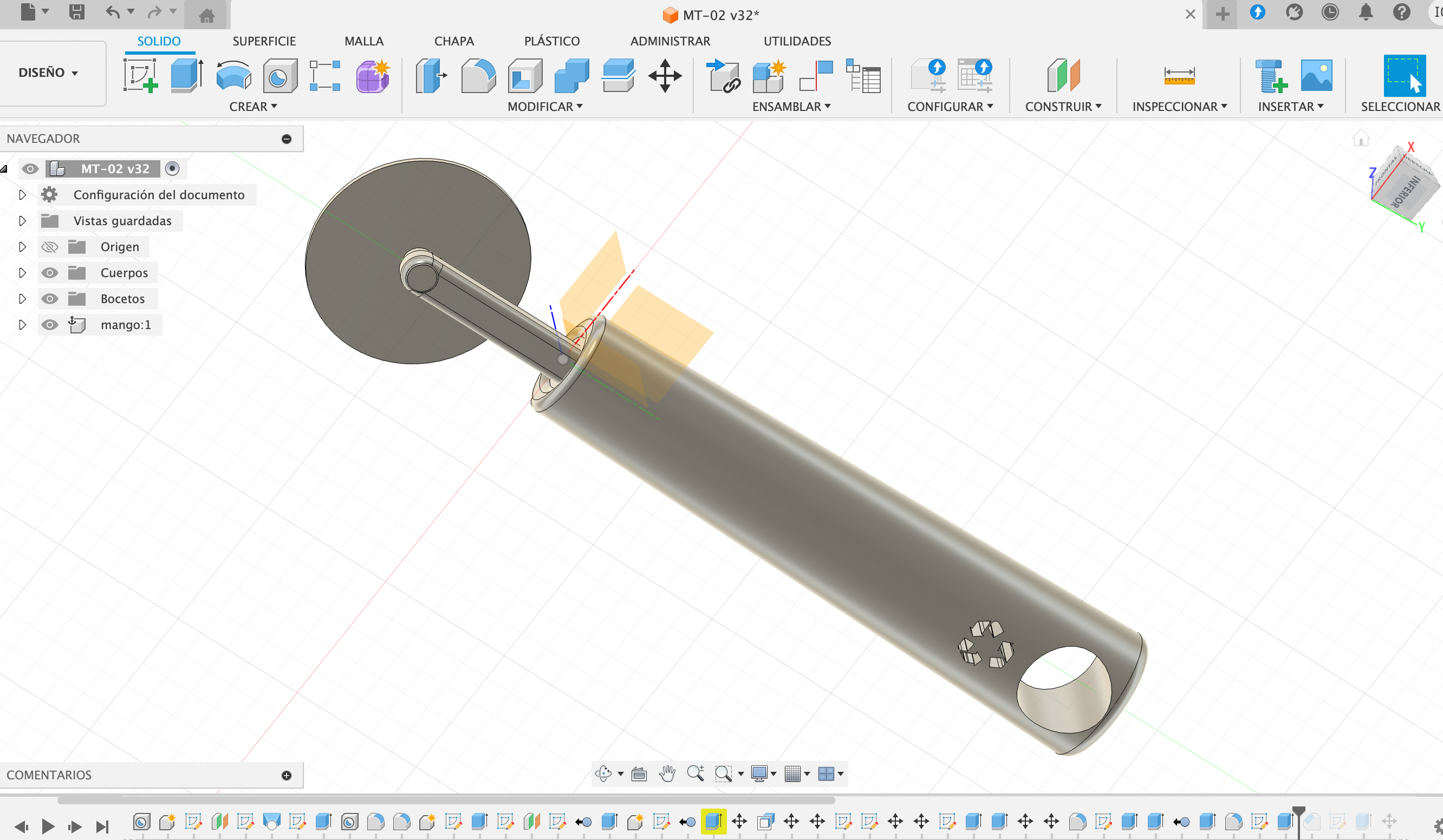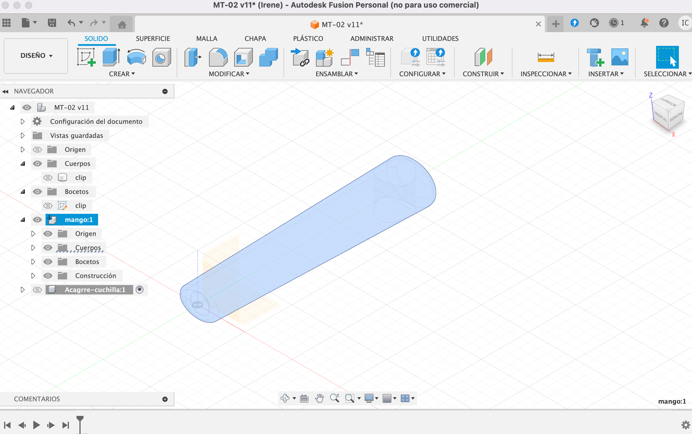 Aca hay que poner atención en como ensamblar con los otros cuerpos, ya que es lo último que se realiza. Considerar la tolerancia para que encastre con el clip que ya está dibujado, y que permite sujetar y girar la cuchilla. Además, que esté centrado y penetre lo suficiente al mango para que quede seguro. - Como paso final empalmar los bordes para que no quede tan rígido y siga con la línea de dibujo de las otras piezas.