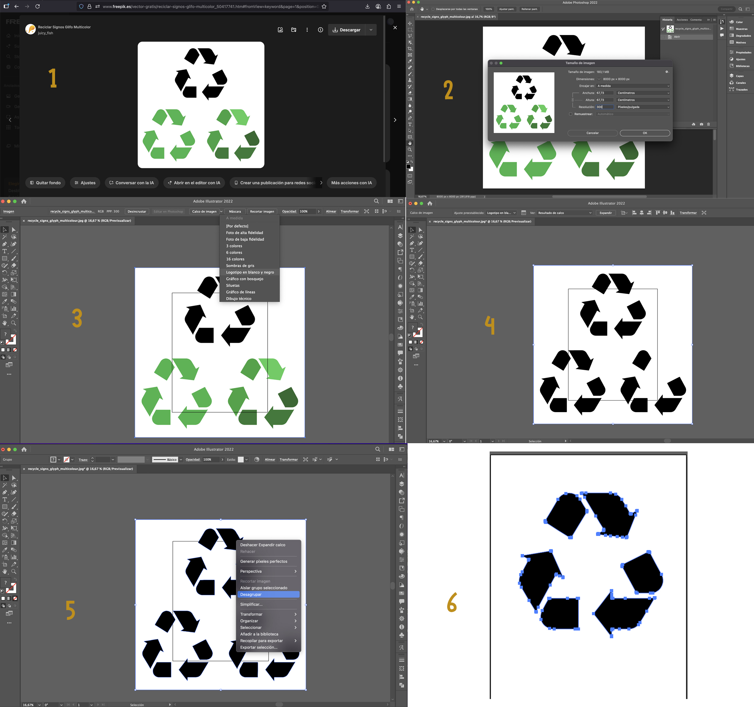 Busqué una imagen del logo de reciclaje en Freepik, una plataforma que ofrece recursos gráficos, donde suele haber material de buena calidad, y tenía varias opciones. 1- Descargar la carpeta de forma gratuita, que si bien ya vienen las versión jpg y vectorial, en este caso tomé la versión jpg para realizar mi propio logo vectorizado.