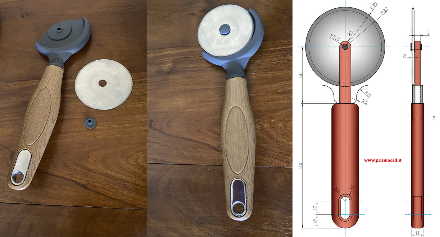 Inspiración y relevamiento de medidas No tengo del todo claro aun por donde va a ir mi proyecto, así que resolví buscar algo en casa para relevar. Entre herramientas y utensilios de cocina me decidí por el cortador de pizza, que combina su mango y agarre con la cuchilla circular. Esto lo asocié a la idea de trabajar en cartón y ciertas herramientas que vi para poder trabajarlo.