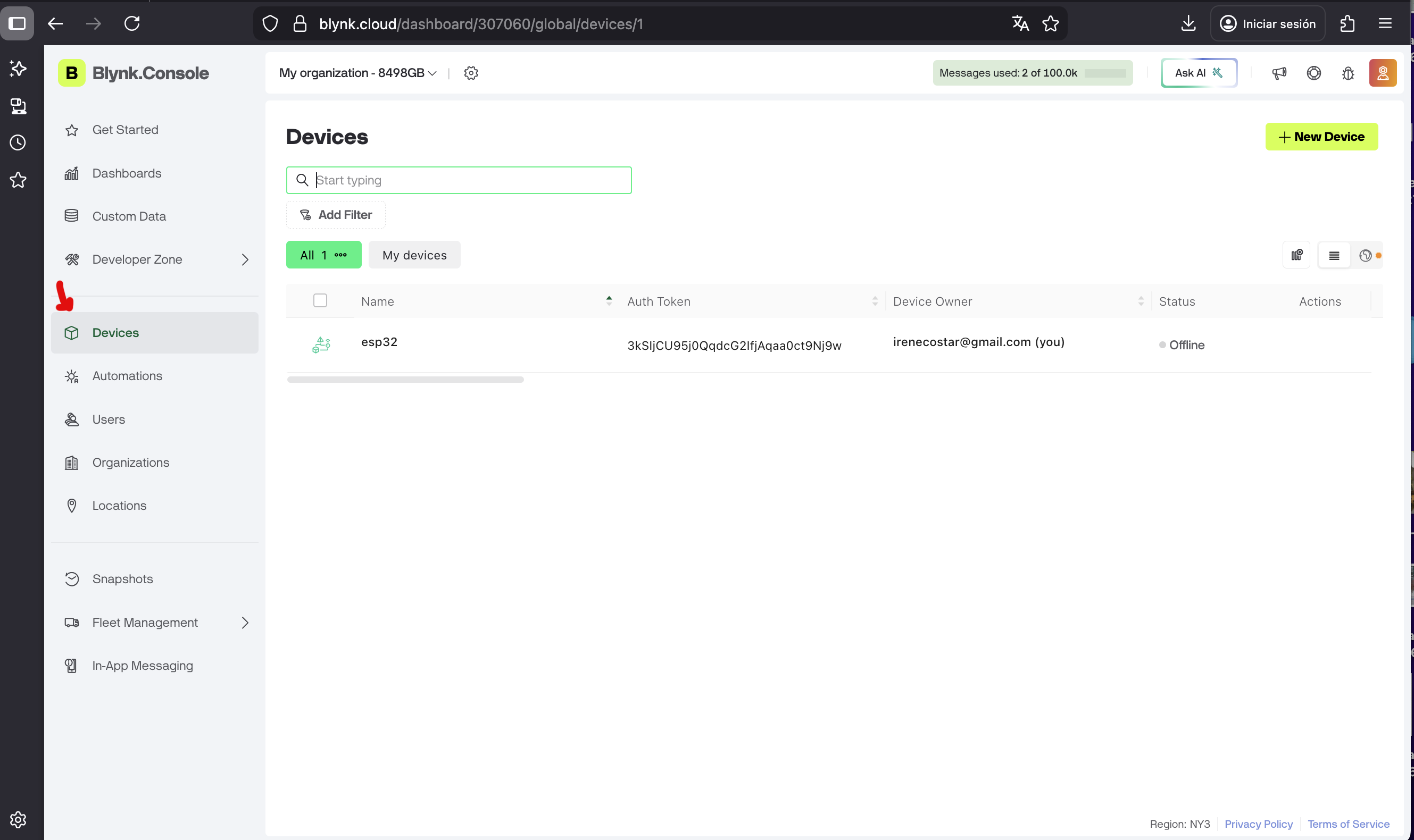 2) Crear un dispositivo Device → el ESP32 real que vas a controlar (este específico que estoy usando), le tengo que decir a donde se va a conectar y que es lo que va a tener que controlar y me asigna un Auth Token para identificar mi ESP32 dentro de Blynk, tiene que saber cuál es el mío.
