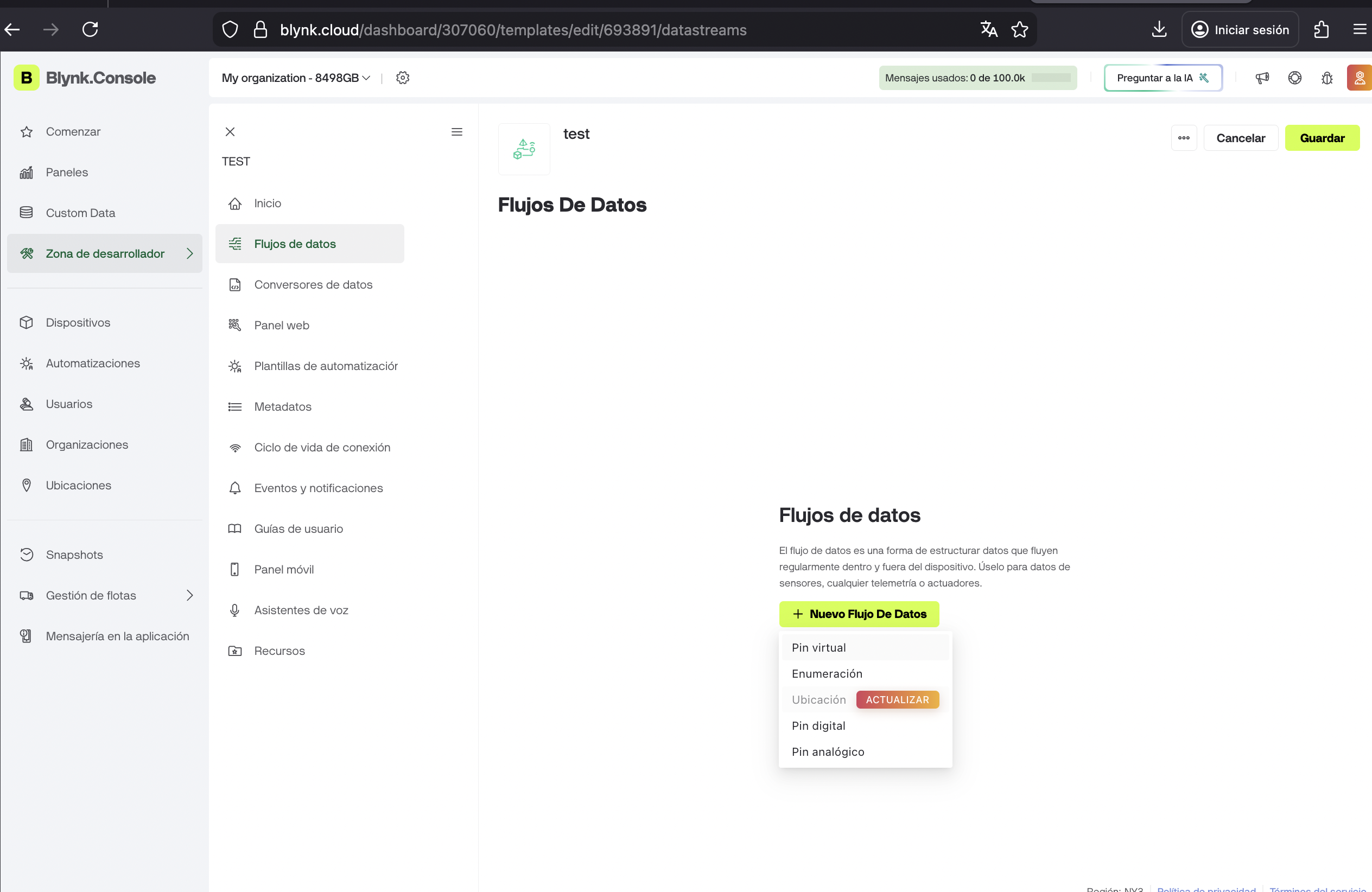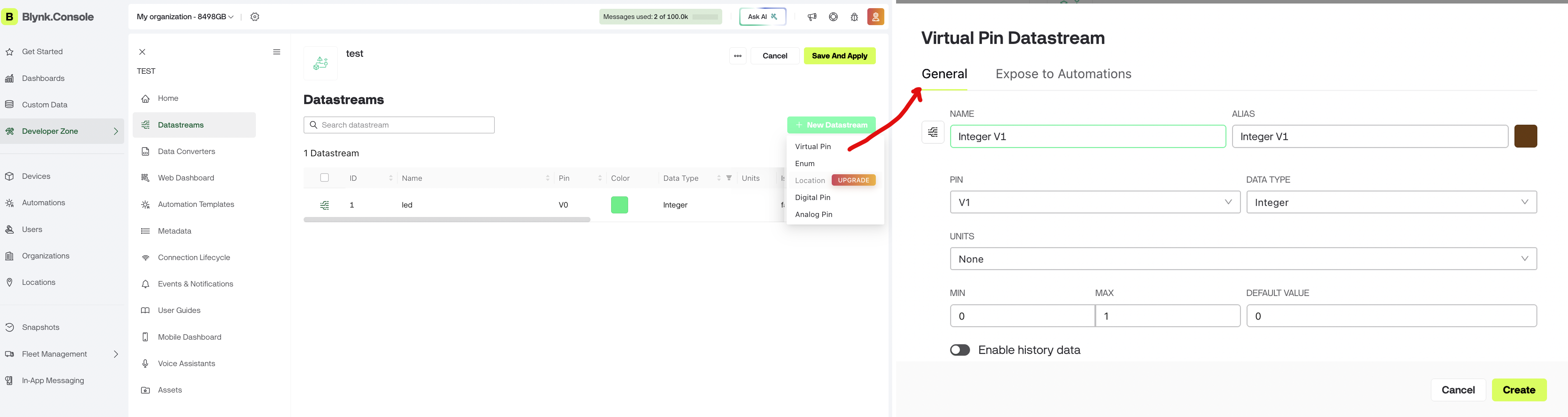 3) Crear el botón (datastream) Flujo de datos Esto es clave 👇 1. Ve a tu Template 2. Entra en la pestaña Datastreams 3. Toca “New Datastream” 4. Elige Virtual Pin 5. Configura: o Name: LED o Pin: V0 o Data Type: Integer o Min: 0 o Max: 1 6. Guarda Blink_3.2